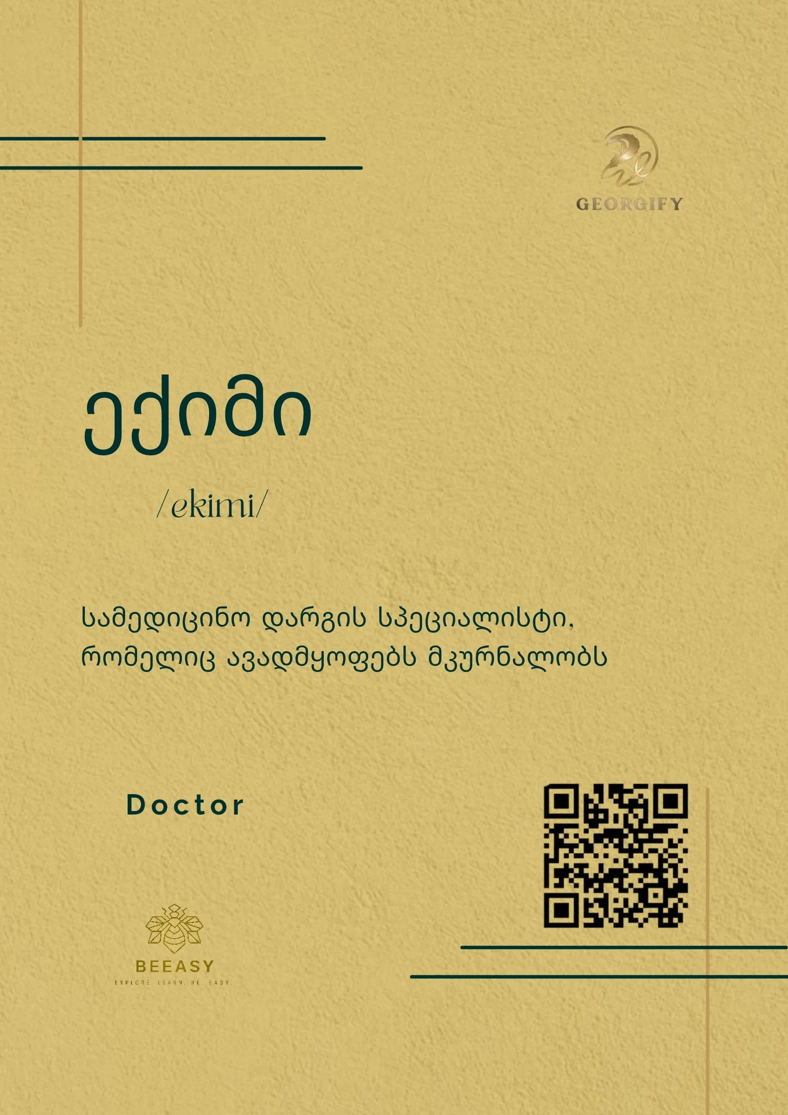 ექიმი - /ekimi/ - Doctor Apr 11 Written By Beeasy Cooperation Definition:სამედიცინო დარგის სპეციალისტი, რომელიც ავადმყოფებს მკურნალობს. Beeasy Cooperation