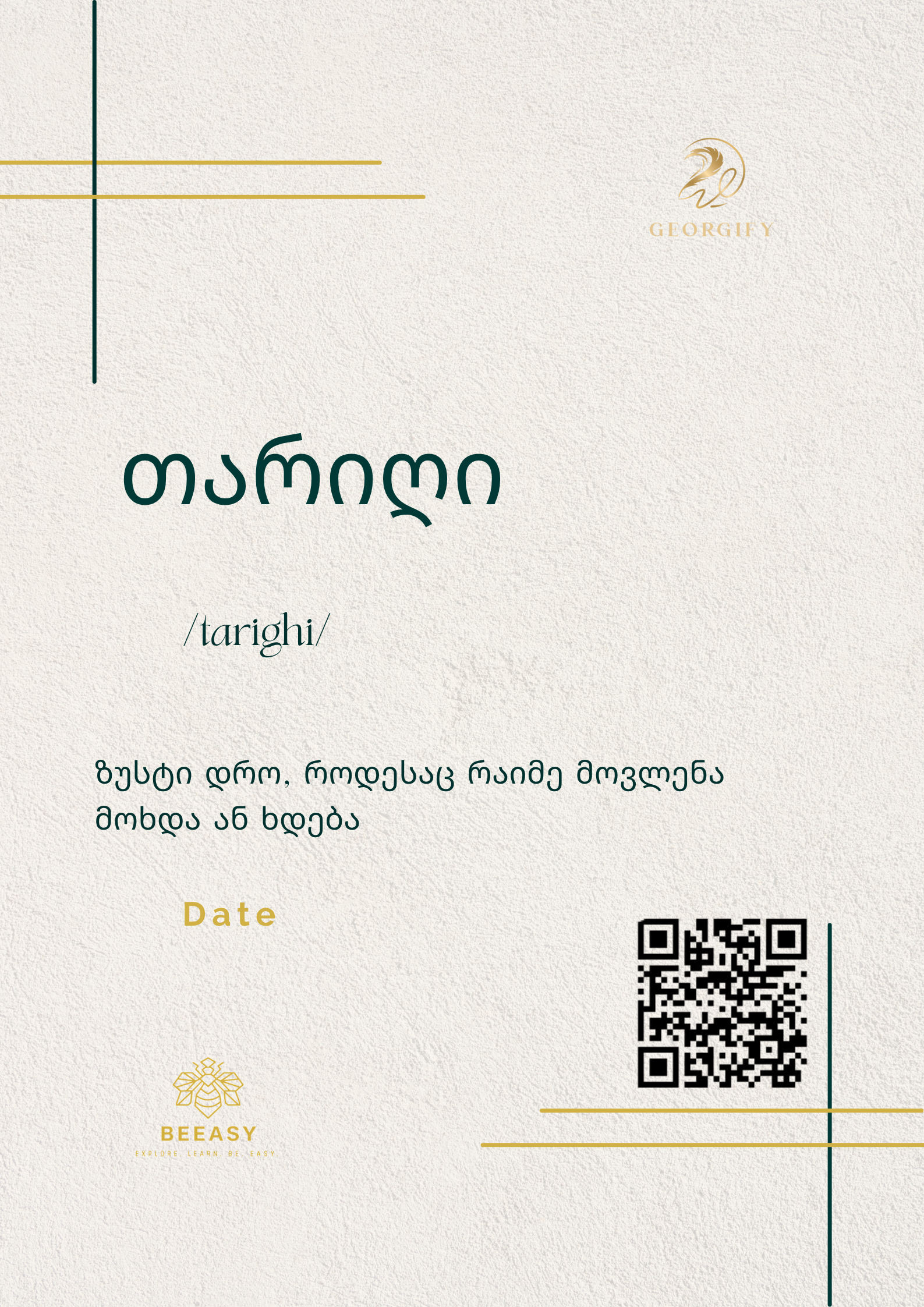 თარიღი - /tarighi/ - Date Jun 7 Written By Beeasy Cooperation Definition:ზუსტი დრო, როდესაც რაიმე მოვლენა მოხდა ან ხდება. Beeasy Cooperation